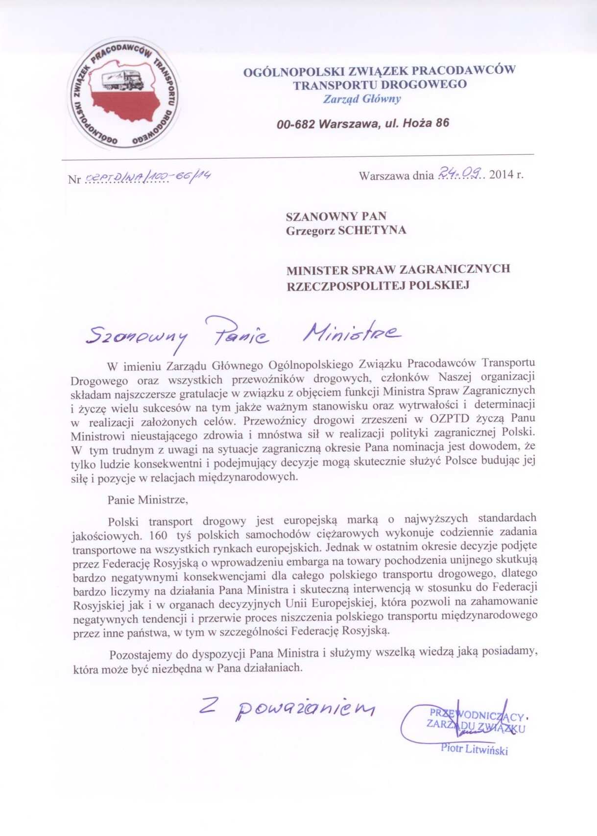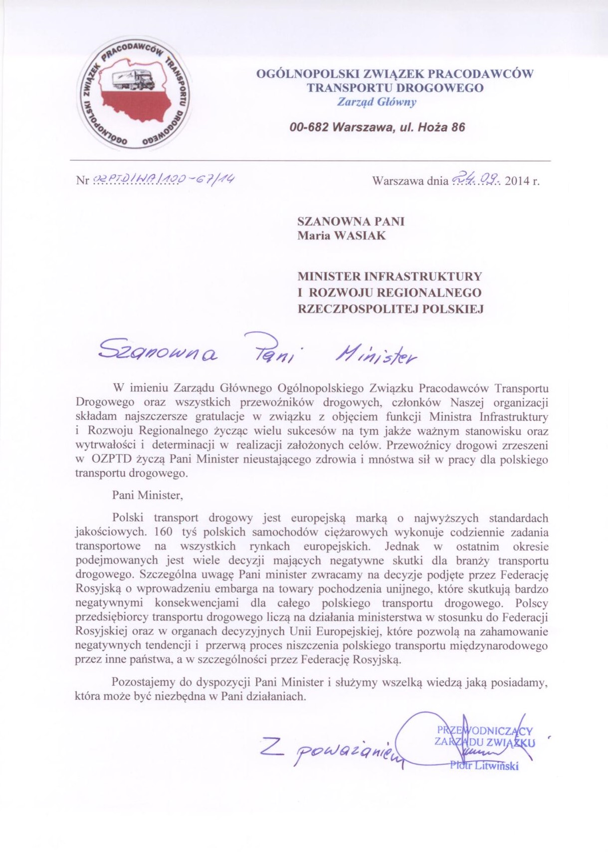 Dnia 22.09.2014 r. urząd Ministra Infrastruktury i Rozwoju objęła Pani Maria Wasiak. Przewodniczący OZPTD - Piotr Litwiński przesłał w imieniu władz Związku i wszystkich członków list gratulacyjny dla Pani Minister z racji objęcia nowego stanowiska.