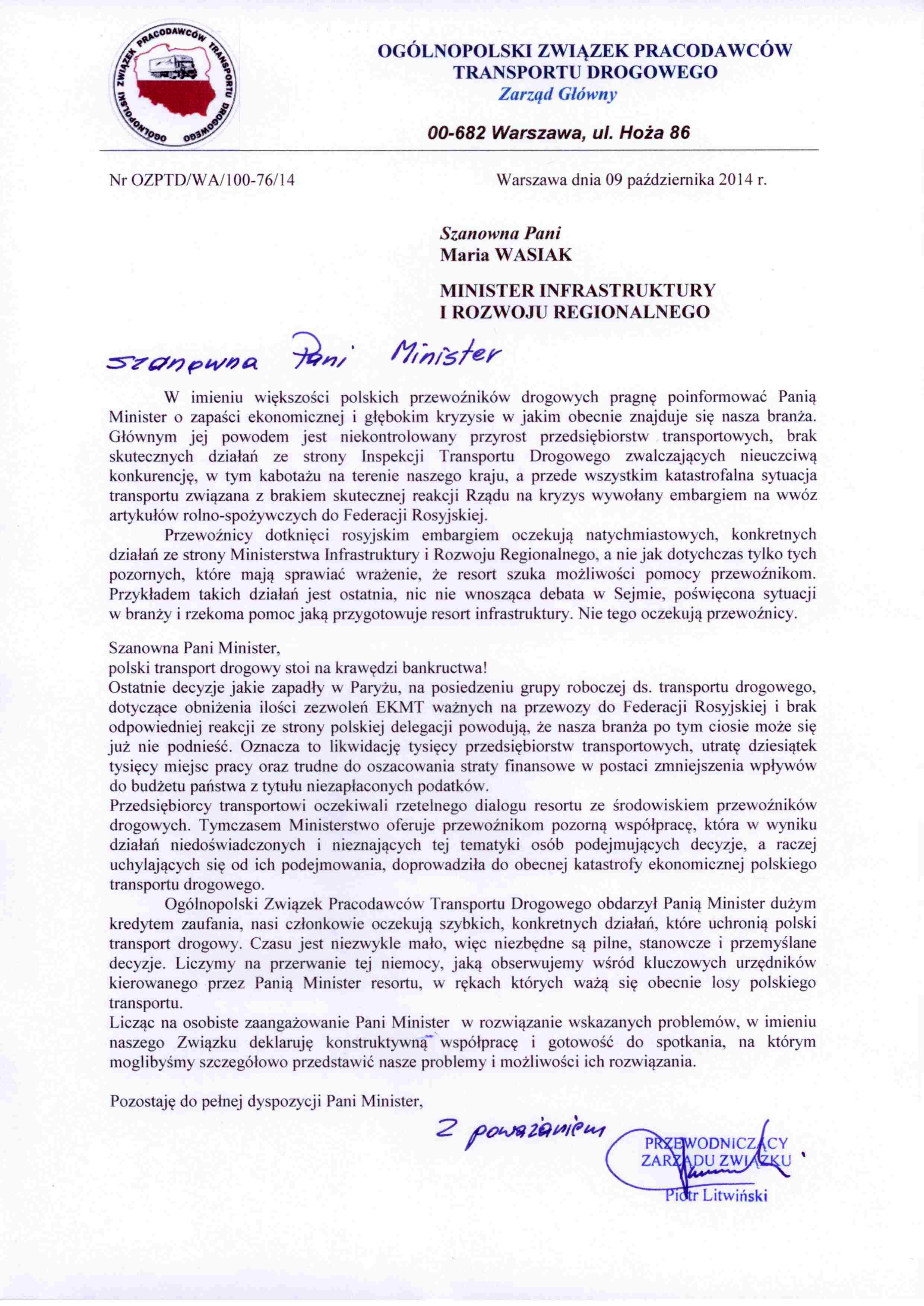 Pismo OZPTD - Pana Piotra Litwińskiego do Pani Minister Infrastruktury i Rozwoju